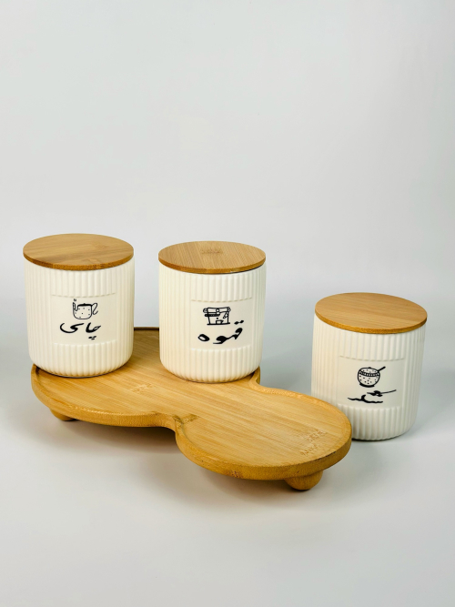 طقم سكر و شايي و قهوه سيراميك و قاعدة بامبو bh-2