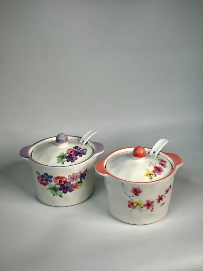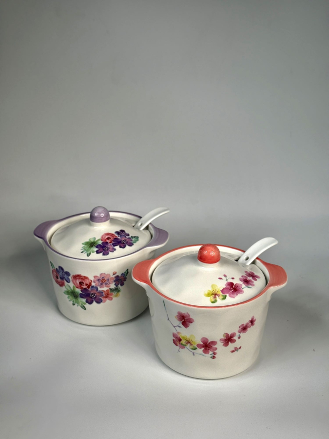 طقم سكر و شايي و قهوه سيراميك و قاعدة بامبو bh-3