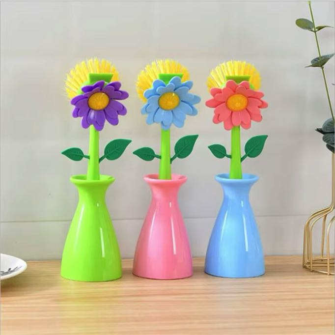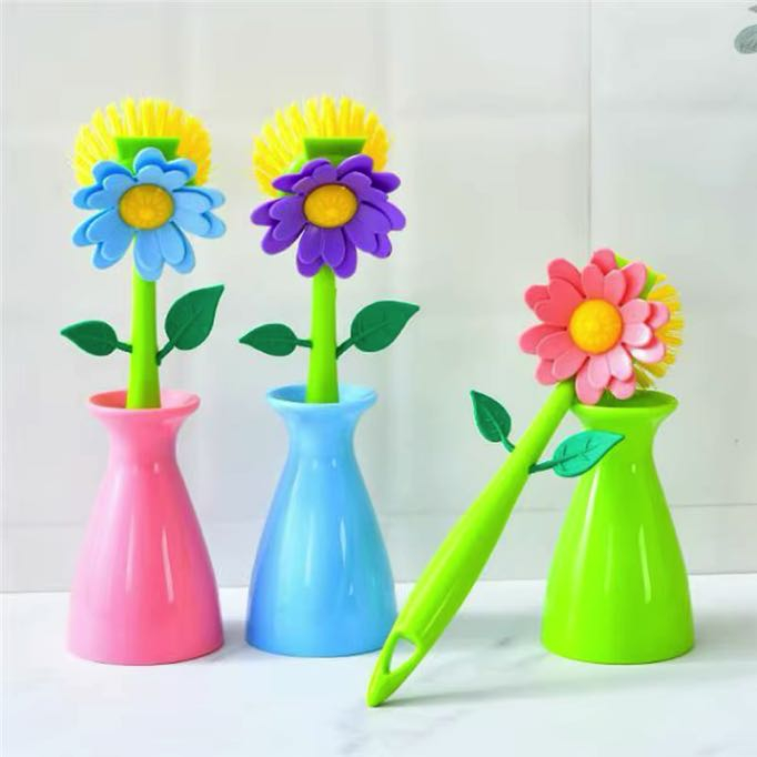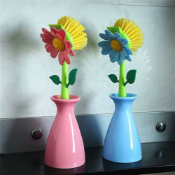 فرشاة اطباق بلاستيكية على شكل زهرة صفراء مع يد