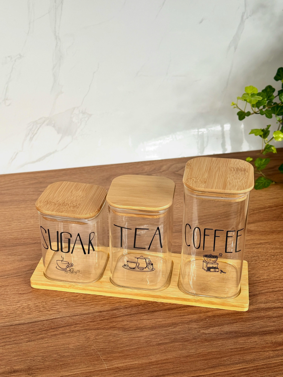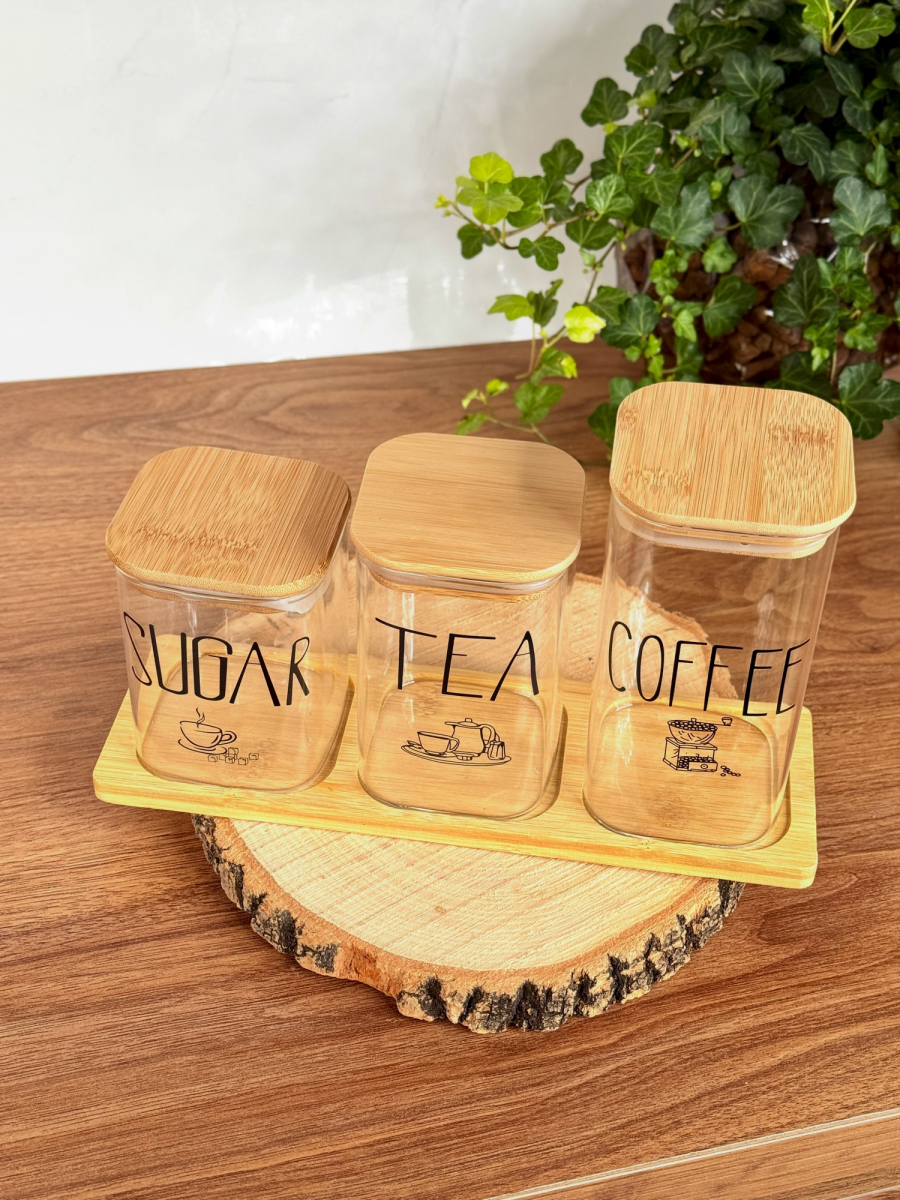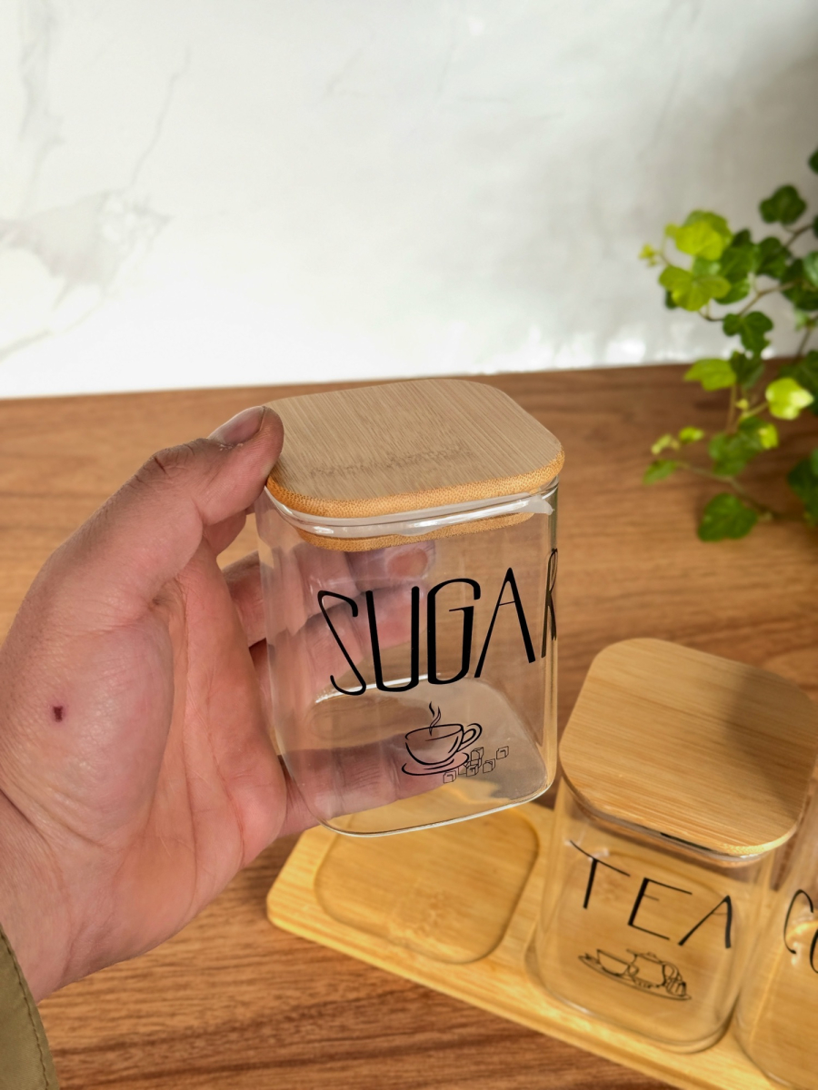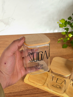 سيت سكر وشايي ثلاثي مربع مع ستاند بامبو