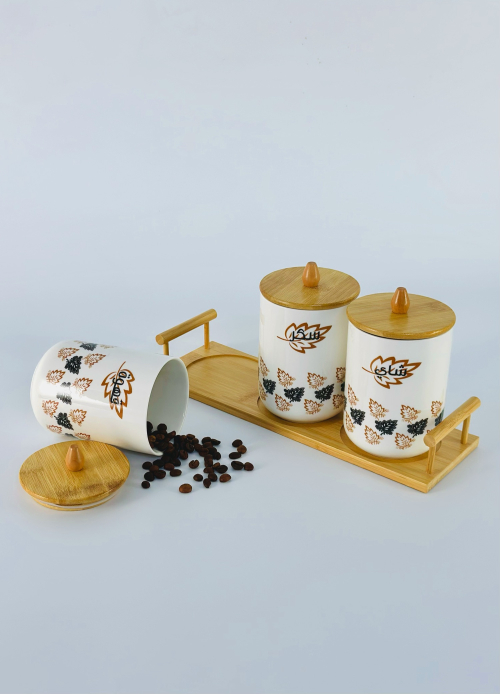 طقم سكر و شايي و قهوه سيراميك و قاعدة بامبو bh-4