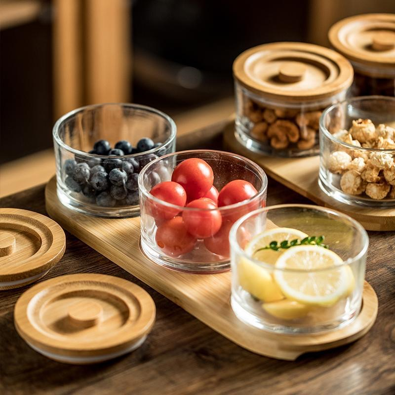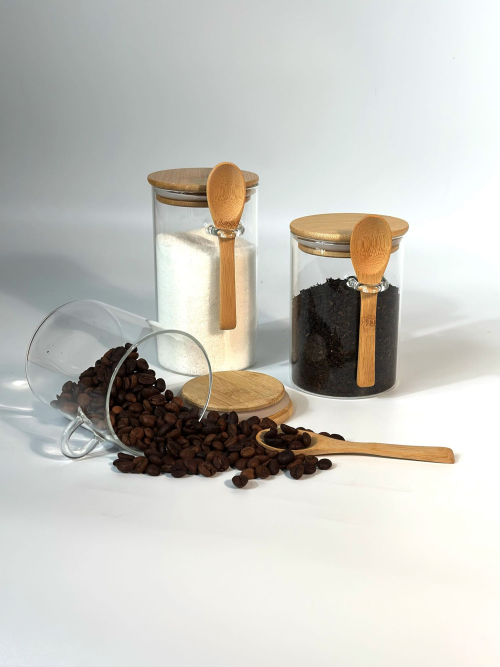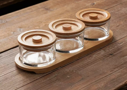 طقم سكر و شايي و قهوه سيراميك و قاعدة بامبو bh-4