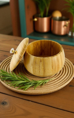 طقم سكر و شايي و قهوه سيراميك و قاعدة بامبو bh-4