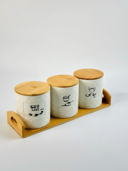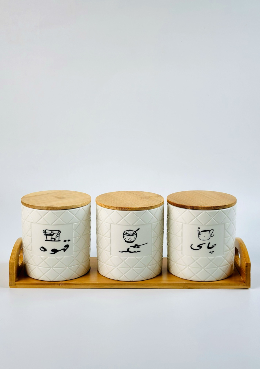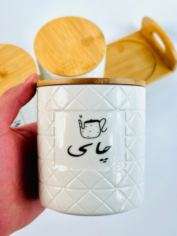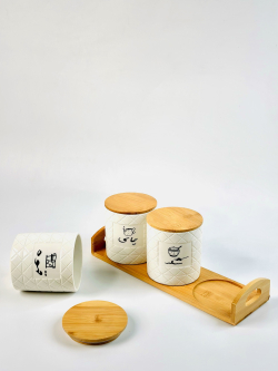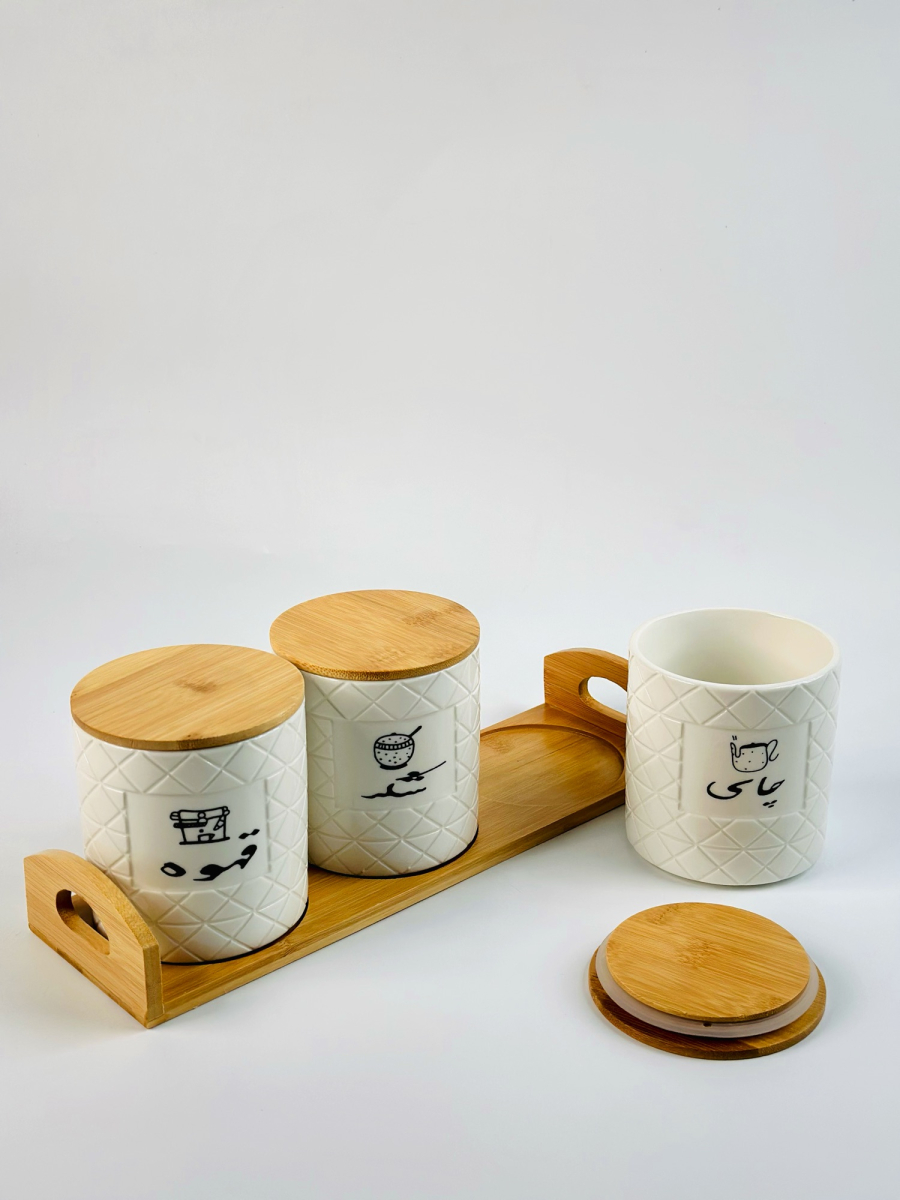 طقم سكر و شايي و قهوه سيراميك و قاعدة بامبو bh-1
