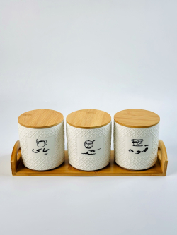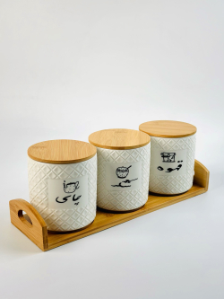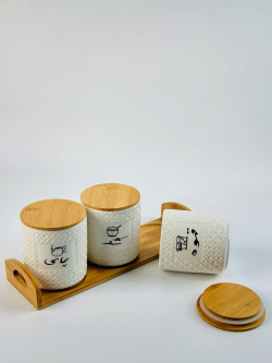 طقم سكر و شايي و قهوه سيراميك و قاعدة بامبو bh-4