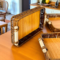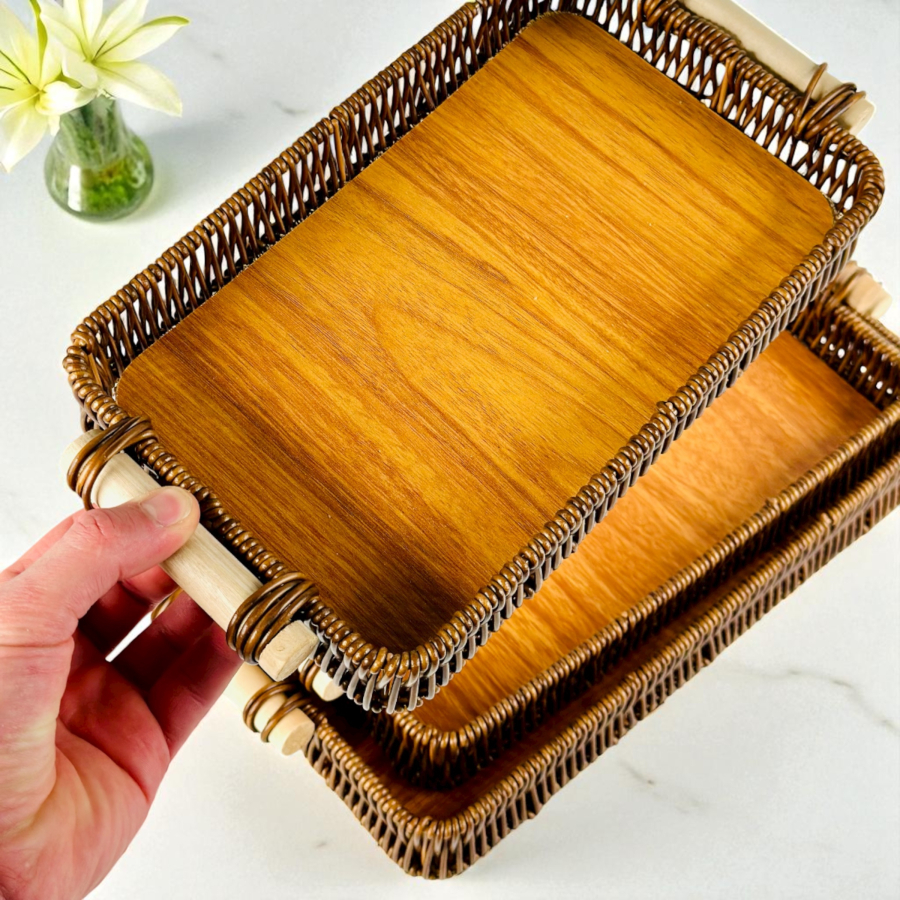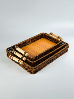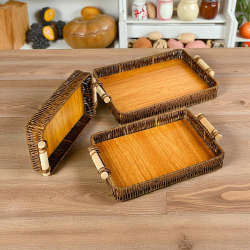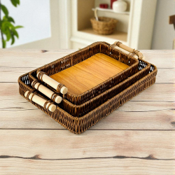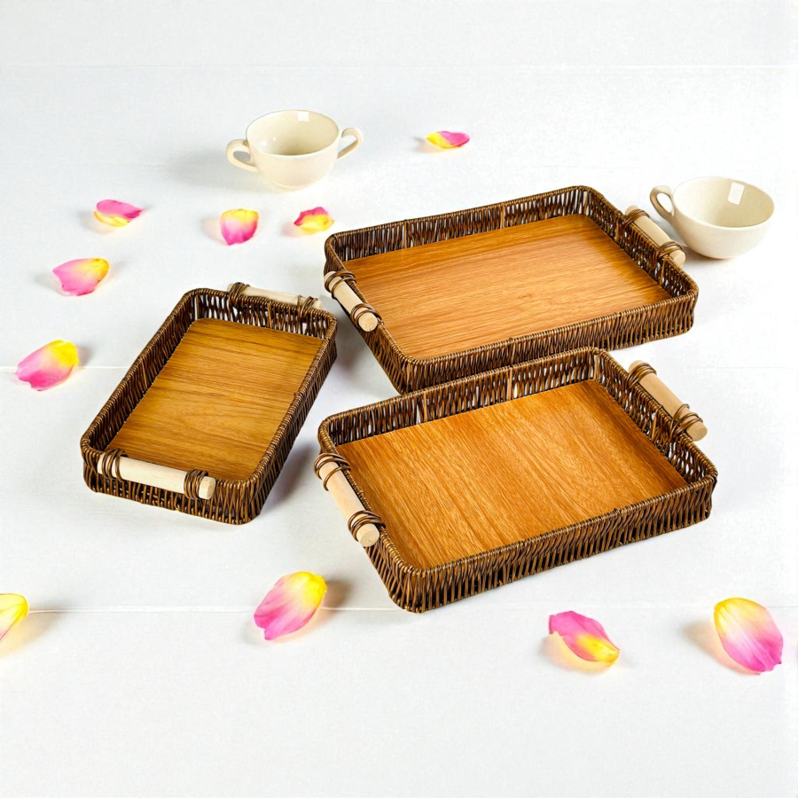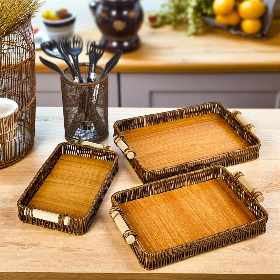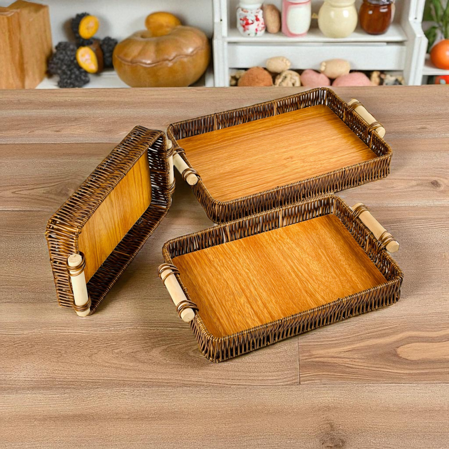 طقم سلة خوص مستطيل ثلاثي يد خشبي
