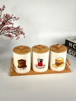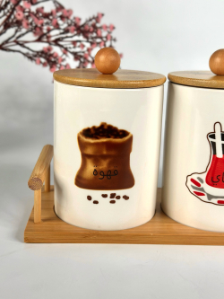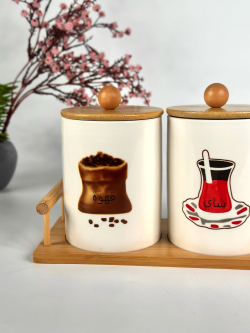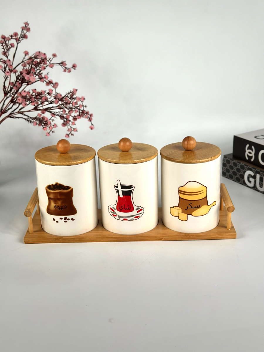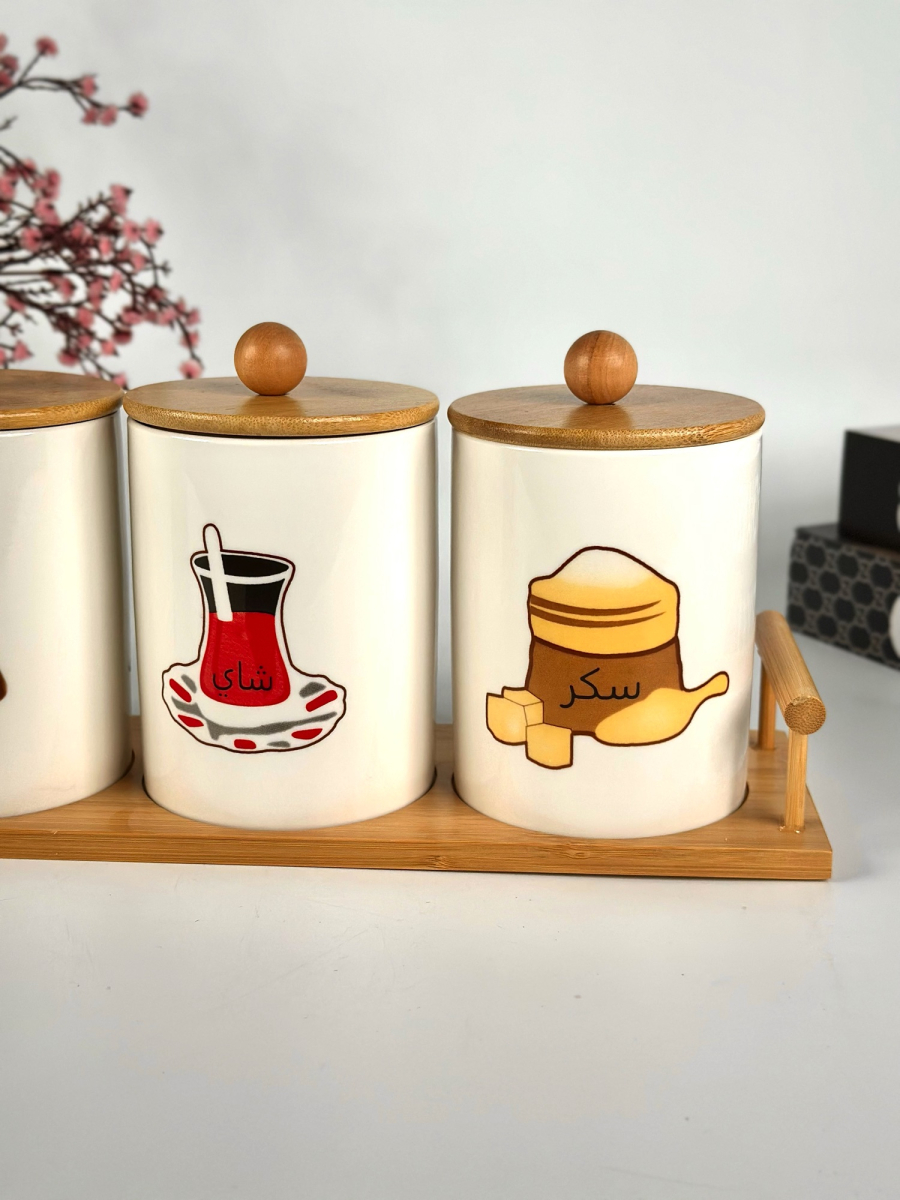 طقم سكر وشايي سراميك مصور مع ستاند بامبو قياس كبير